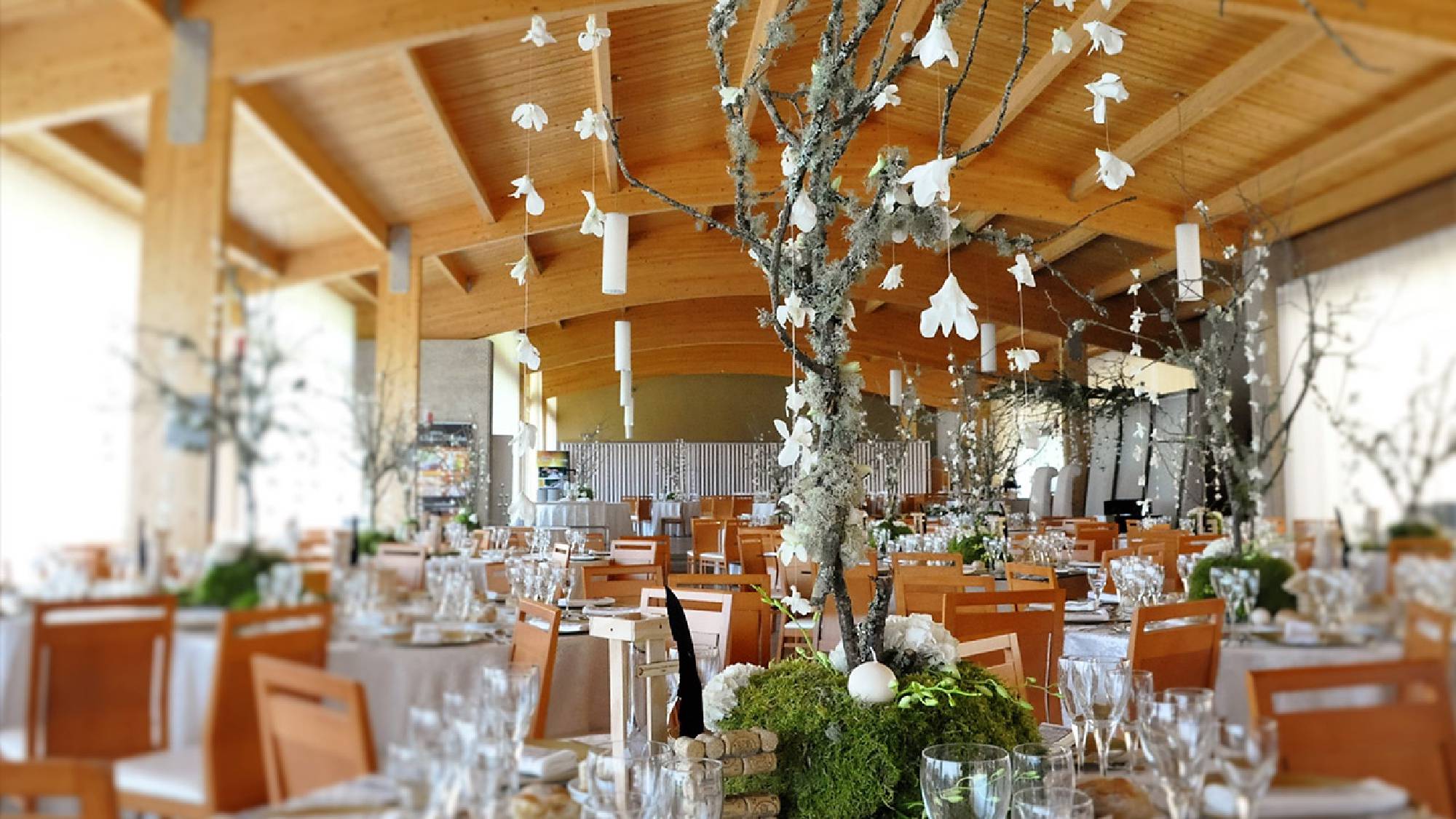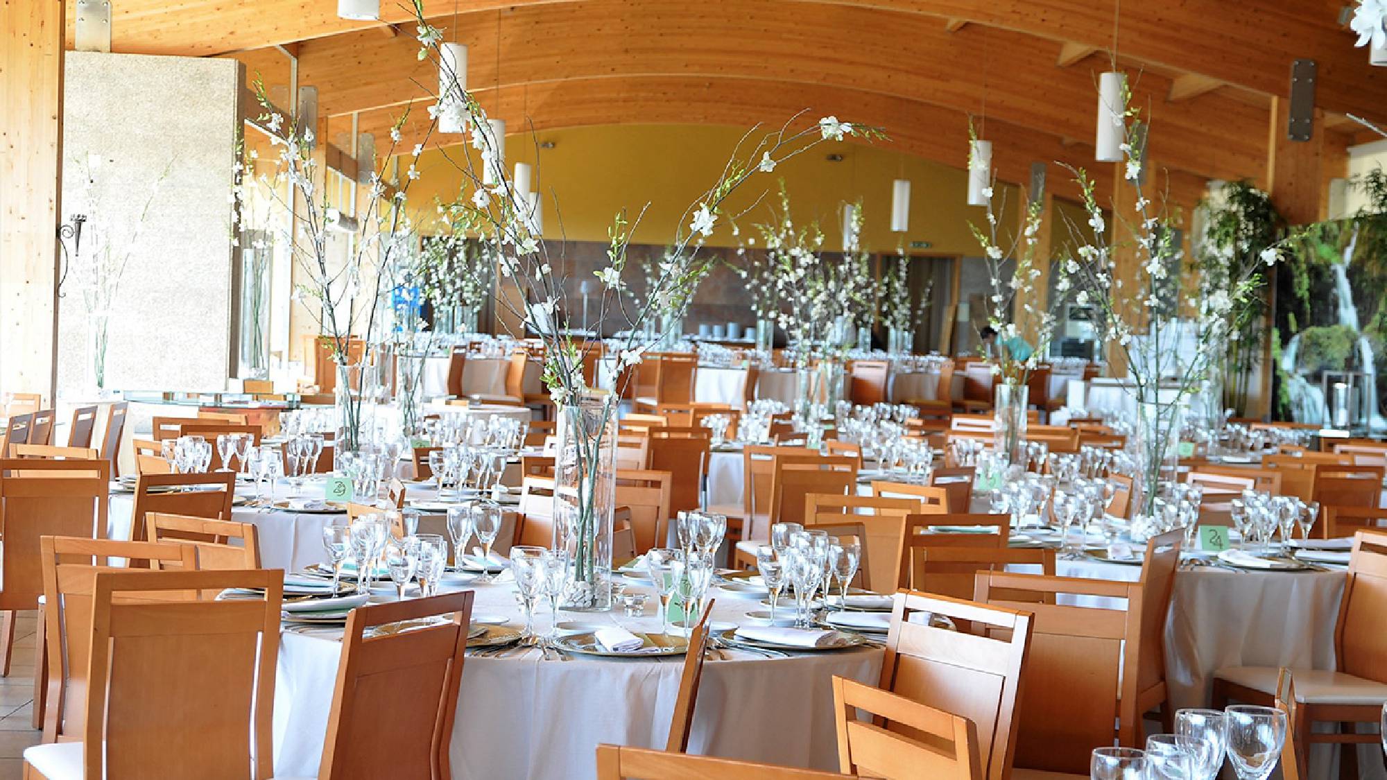 A beleza do salão, com capacidade para 450 pessoas, resulta da sábia conjugação entre o tecto de madeira, as paredes em vidro e a varanda panorâmica, que proporciona o contacto directo com a paisagem envolvente das margens do rio Vouga.